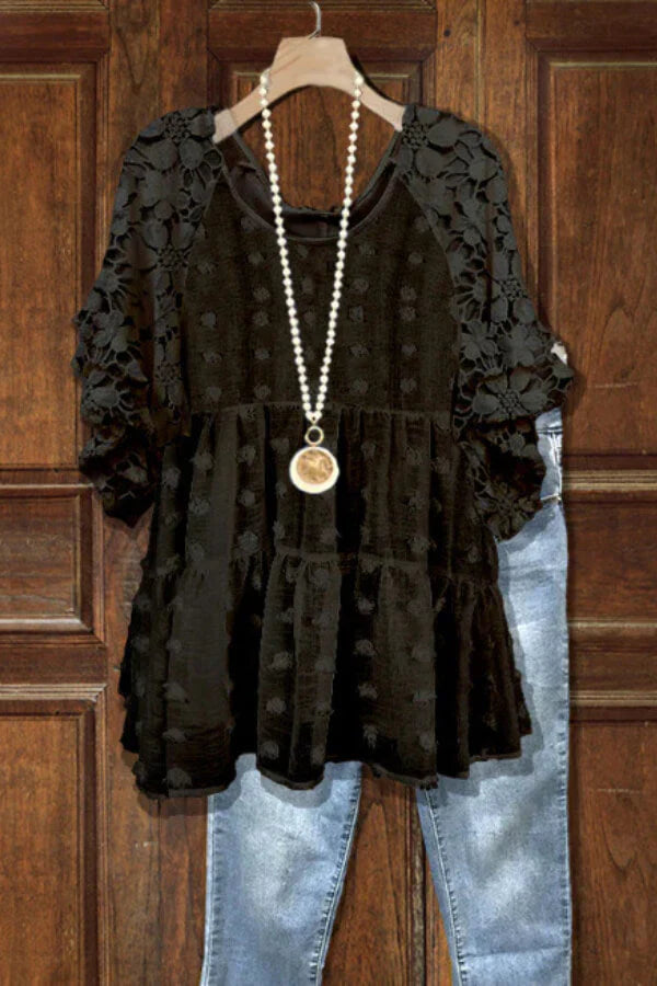 Élégance avec notre chemisier en mousseline à manches volantées en dentelle, un ajout sophistiqué à toute garde-robe.