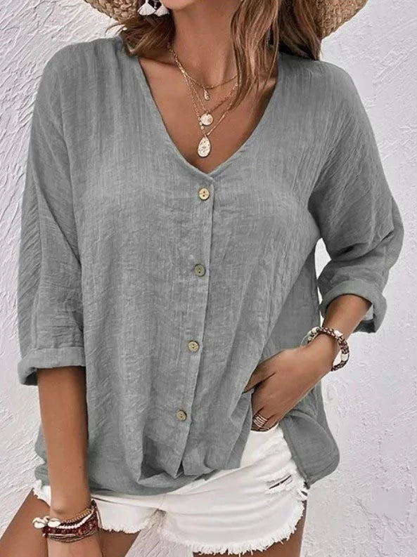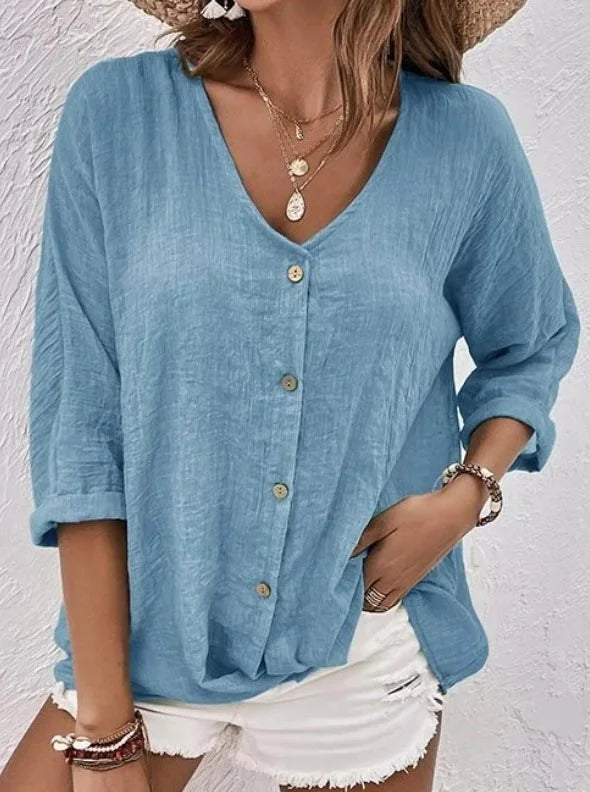 Tania - Top à manches longues et col en V avec boutons confortables en coton et lin