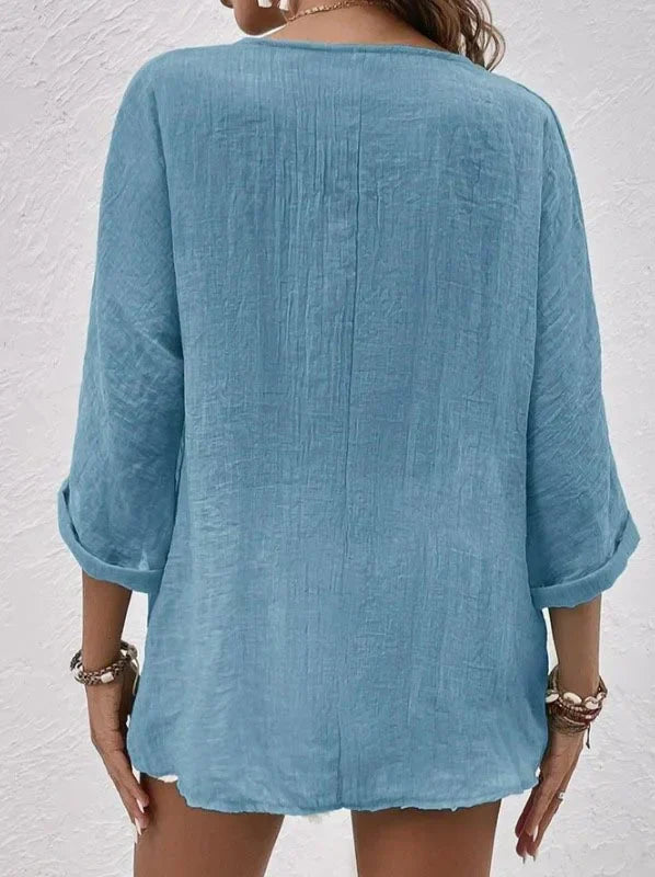 Tania - Top à manches longues et col en V avec boutons Le charme du coton et du lin : élégance naturelle et confort total