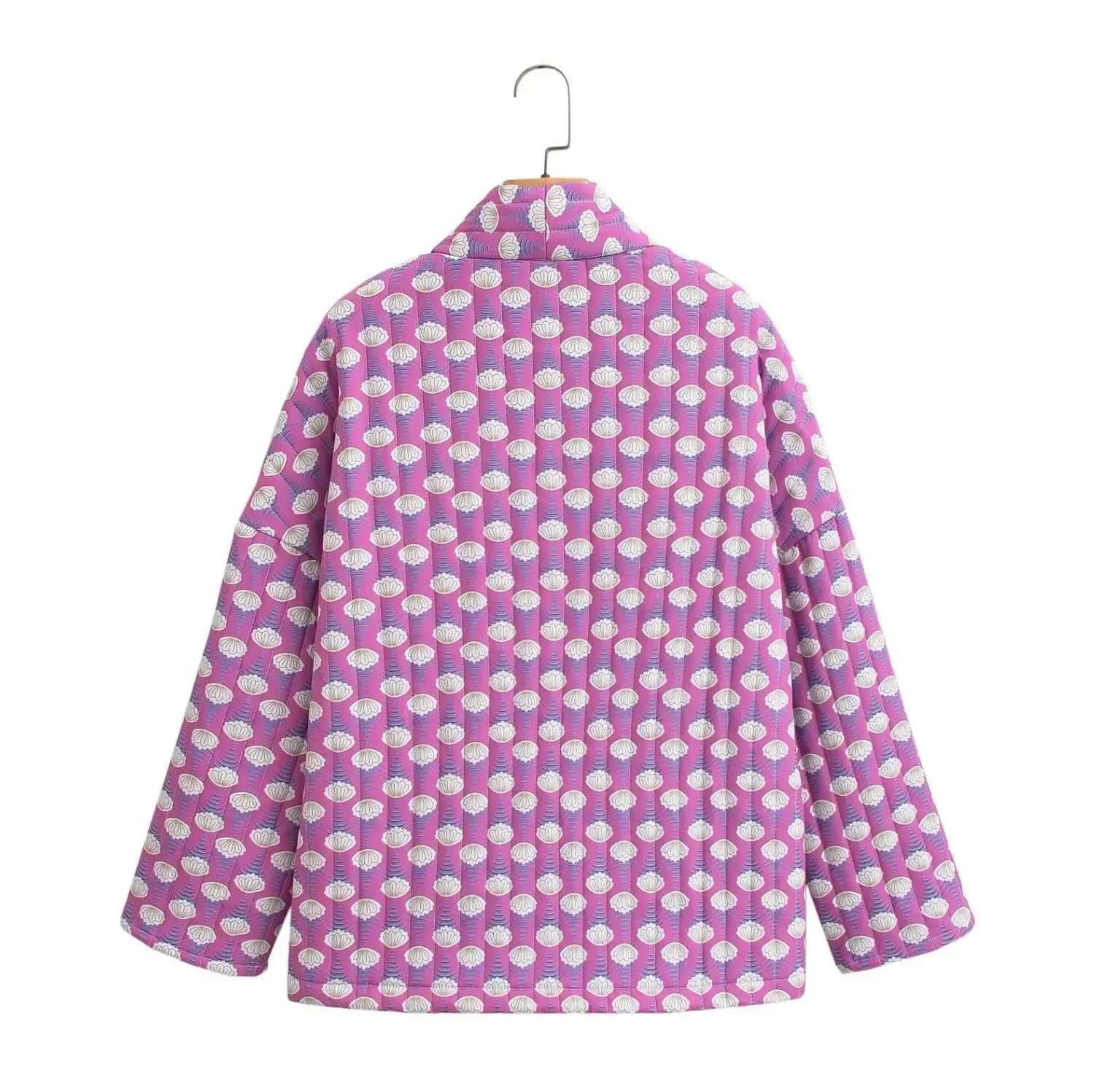 Cette veste présente des motifs uniques de coquillages roses et violets qui ajoutent une charmante touche indie folk à votre tenue. Son encolure en V et sa fermeture à coutures ouvertes offrent une coupe décontractée. Conçue avec des manches longues et une épaisseur standard, la Gigienne vous tient au chaud tout en conservant une touche d'élégance.